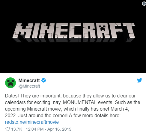 A Mojang e Warner Bros. fizeram uma parceria para criar um novo filme do Minecraft que agora tem uma data de lançamento, apesar do filme não ter saído há um tempo atrás. O filme do Minecraft vai aos cinemas em 4 de março de 2022, uma data que a Mojang reconhece estar longe, mas ressaltou que fazer um longa-metragem “é realmente complicado”. Um post no site Minecraft compartilhou mais informações sobre o novo filme, e quem estará dirigindo e sobre o que será.
